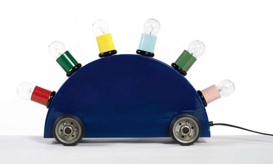 Corps en demi-lune en fibre de verre teintée bleu, hérissé à la partie supérieure de cylindres en métal laqué polychrome accueillant les ampoules| reposant sur quatre roues en aluminium et caoutchouc.