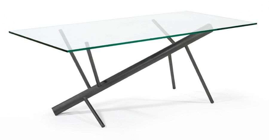 TABLE DE SALLE À MANGER Plateau rectangulaire en verre translucide reposant sur un axe central en métal laqué époxy, constitué d'un cylindre en biais d'où partent des tubes désaxés| l'ensemble symbolisant un tronc d'arbre renversé.