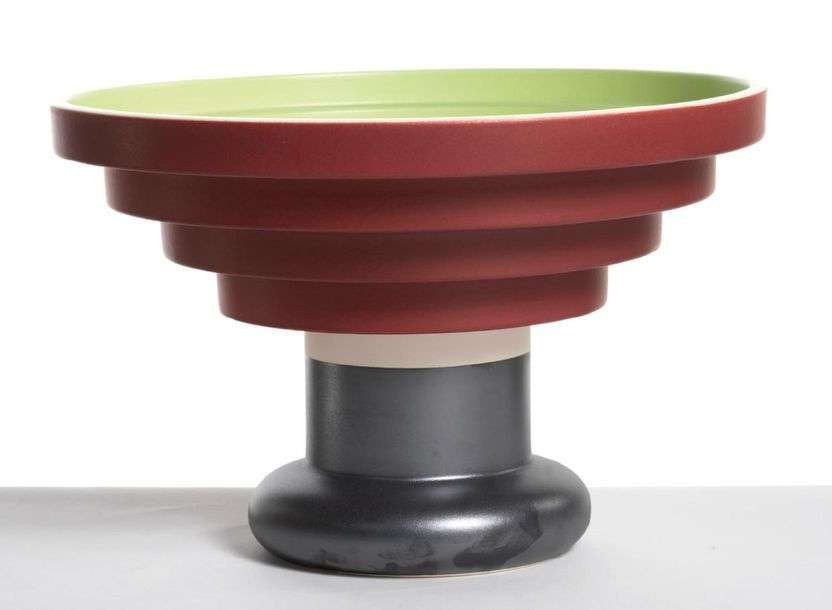 GRANDE COUPE SUR TALON À GRADINS En faïence émaillée noir métallisé à la base, violine et vert pomme à la partie supérieure.