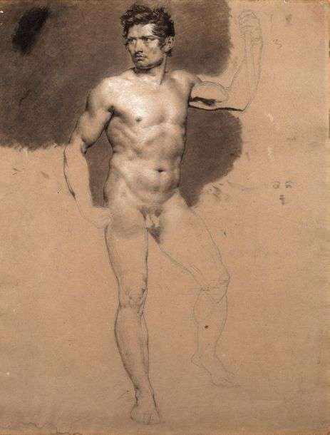 Les deux académies présentées aujourd'hui à la vente sont d'autant plus exceptionnelles qu'elles représentent des modèles masculins nus et sont l'oeuvre d'une peintre. Nous savons qu'à contre-courant des moeurs de l'époque, David avait choisi de dispenser son enseignement à des jeunes femmes et s'il dut une première fois fermer l'atelier qu'il avait ouvert en 1787, nous savons qu'il en ouvrit un nouveau rue du Faubourg-Saint-Martin où régulièrement, il déposait certains de ses dessins en guise de modèles. Peut-être est-ce dans ce contexte que notre peintre eût accès à des modèles nus, laissant entrevoir qu'elle allait pouvoir s'essayer au Grand Genre.