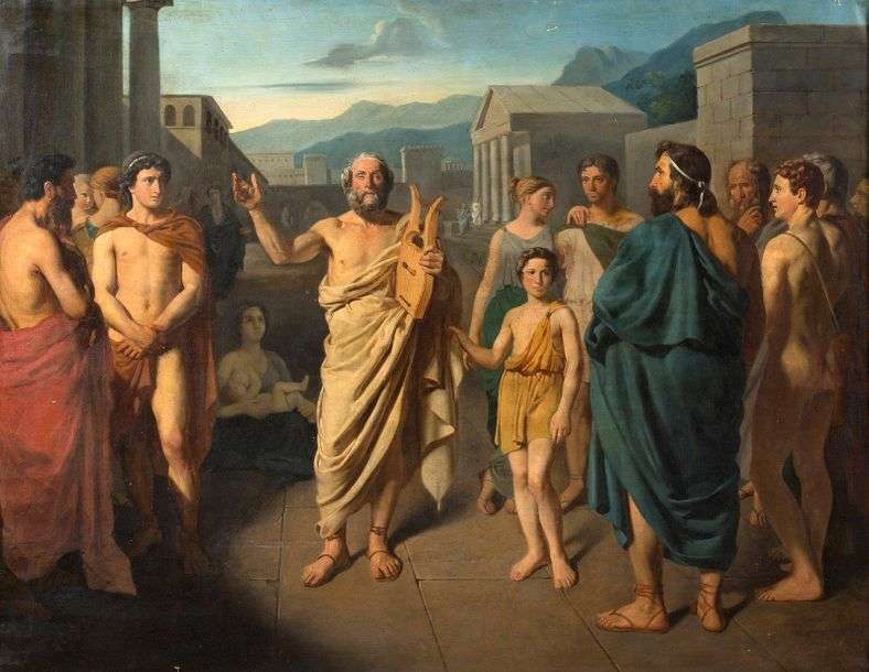 L'œuvre est probablement une étude pour le Grand prix de 1834 dont le théme cette année là était Homère chantant ses poésies dans les villes de Gréce.