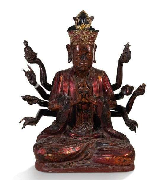 Importante sculpture en bois laqué rouge et or, représentant Avalokitesvara à douze bras assis en méditation, les mains jointes en présentation d'offrandes, la couronne ornée de fleurs, surmontée d'un chignon à motifs de dragons stylisés et du joyau.