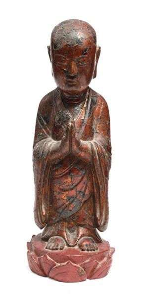 Petit adorant en bois anciennement laqué or debout sur un lotus les mains en anjalimudra.