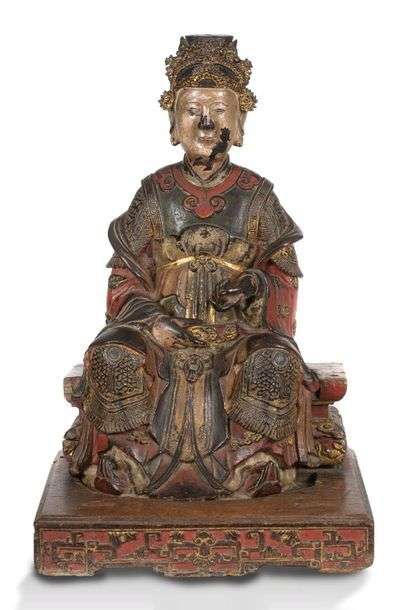 Important sujet en bronze laqué, représentant une déesse mère, assise en majesté, le visage surmonté d'un diadème, le col représentant des têtes de ruyi, les détails du costume finement ciselés, avec beau mouvement des plis de la robe ornée de nuages.