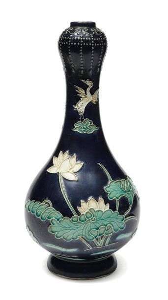 Fahua, à décor sur fond bleu nuit de grues et lotus en léger relief blanc et turquoise, l'ouverture ornée de têtes de ruyi et perlages.
