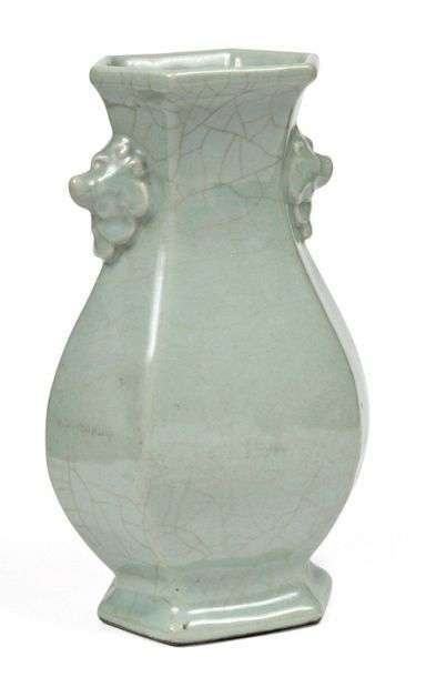 Vase balustre hexagonal en céramique et émail céladon craquelé, deux anses zoomorphes ornant le col.