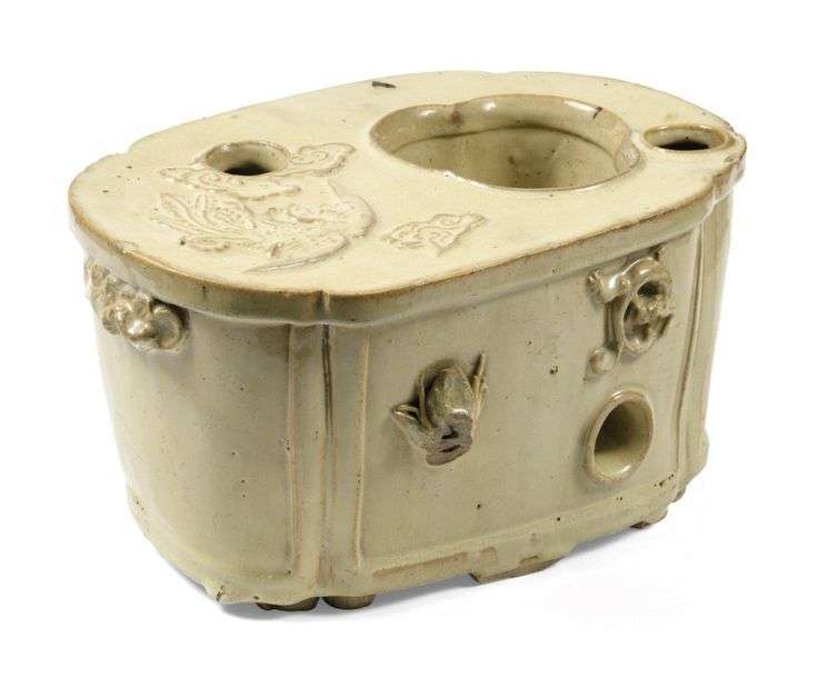 Chaufferette quadrilobée en grès émaillé crème, la partie haute ouvrant sur une cuve et deux orifices permettant de verser de l'eau chaude à l'intérieur, à décor en relief d'un phénix parmi des nuages, et d'un chilong et un insecte sur la paroi verticale, rythmée de montants.