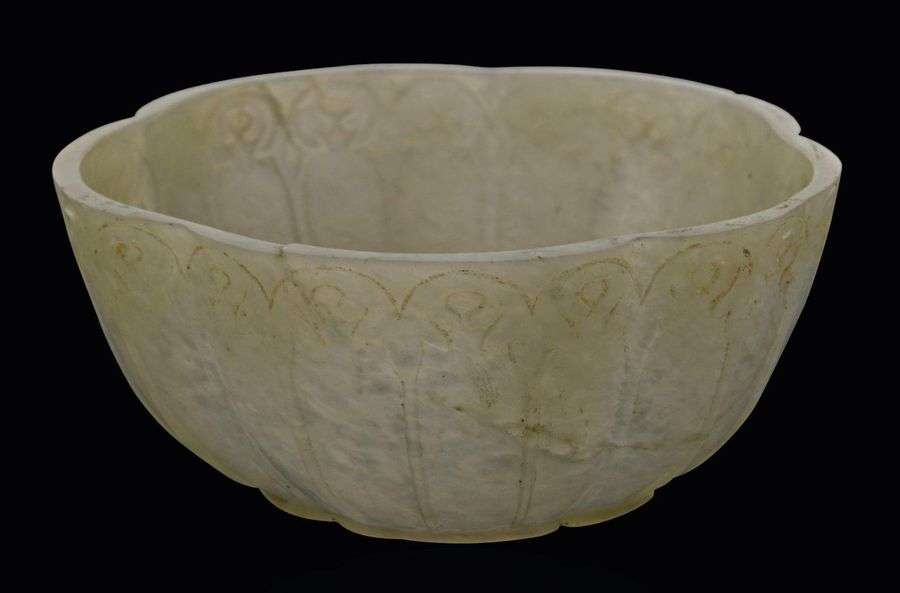 Petite coupe polylobée évoquant une fleur de prunus, en jade blanc céladonné, ornée à l'extérieur de pétales stylisés en léger relief surmonté d'un motif feuillagé, la base en forme de fleur de prunus.