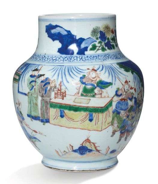 Vase de forme balustre en porcelaine et émaux de type wucai à décor d'acteurs représentant des scènes de guerres devant un haut dignitaire sur une terrasse arborée.