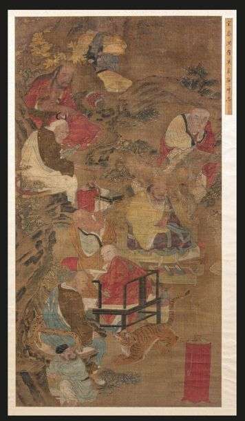Peinture à l'encre et couleurs sur soie, représentant sept luohan assis sur des sièges ou des rochers, l'un accoudé à une roche. Avec une signature apocryphe