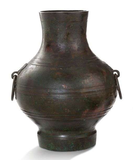 Vase Hu à patine contrastée, à deux anses en forme de masques de taotie retenant des anneaux.