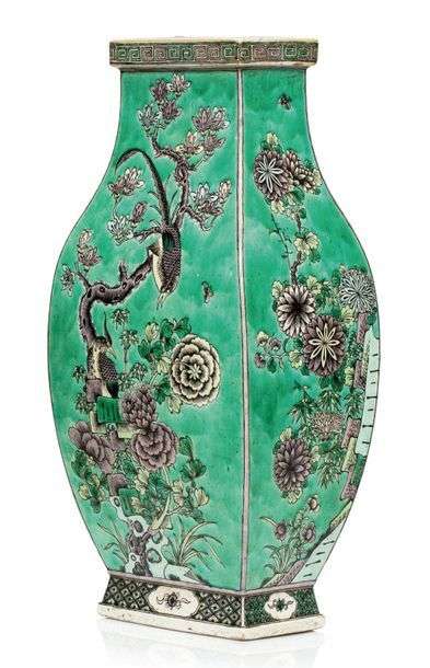 Grand vase de forme Hu en porcelaine et émaux famille verte à décor de faisans parmi des pivoiniers en fleurs, prunus et chrysanthèmes. Le col orné d'une frise de grecques.