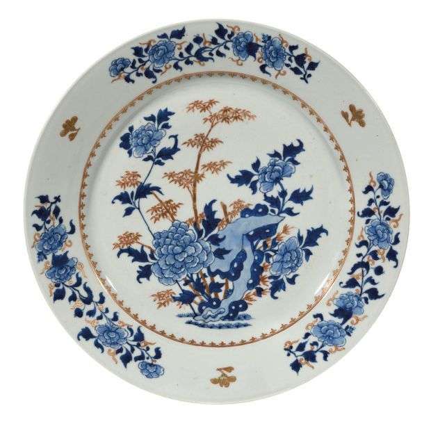 Plat en porcelaine dite Imari, à décor en bleu sous couverte et rehauts de corail et or de chrysanthèmes, bambous et rochers au centre, l'aile ornée de rinceaux de chrysanthèmes.