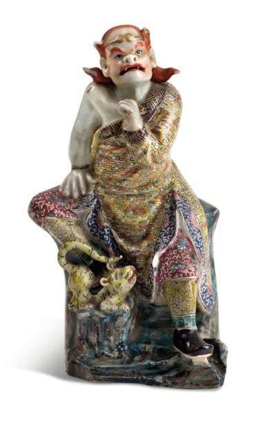 Sujet en porcelaine émaillée de la famille rose représentant Wu Song, un des héros du roman «Au bord de l'eau», assis sur un rocher, le pied droit posé sur un tigre.