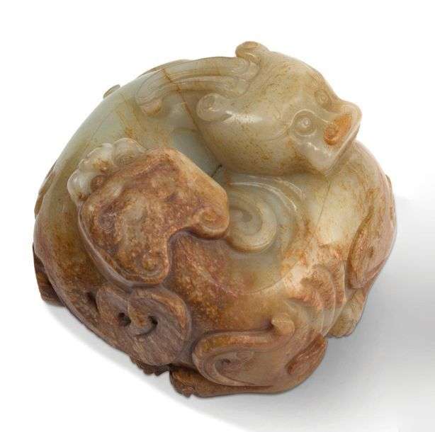 Groupe en jade céladon partiellement veiné de rouille, représentant deux Qiling lovés l'un contre l'autre.