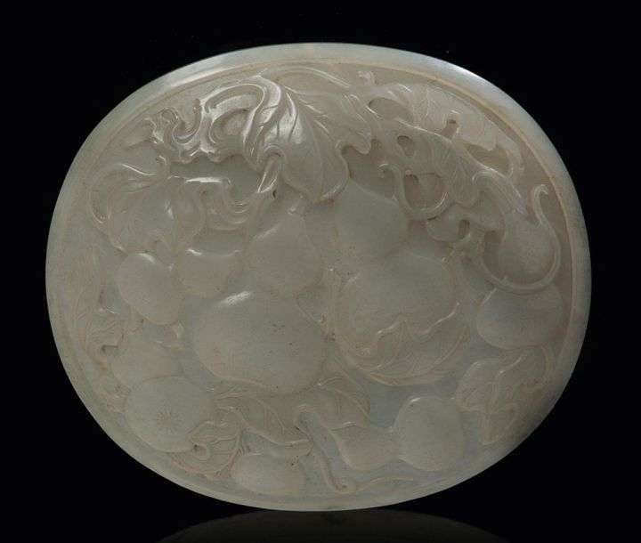 Plaque de sceptre en jade céladon, à décor de coloquintes parmi des feuillages.