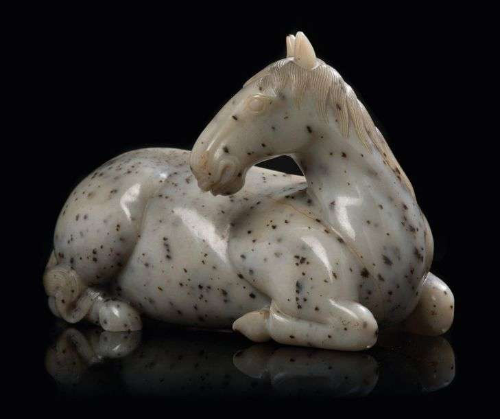 Exceptionnelle sculpture en jade céladon partiellement veiné de brun, figurant un cheval à la robe gris moucheté, représenté au repos, les jambes repliées, la tête regardant vers l'arrière, la crinière et la queue finement ciselées.