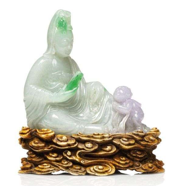Groupe en jadéite légèrement infusée de vert et mauve, représentant la déesse