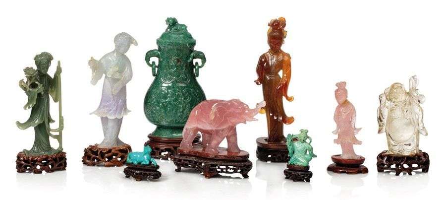 Ensemble de neuf objets en pierres dures sculptés, comprenant quatre déesses du printemps en jade vert, agate cornaline, quartz rose et en jadéite infusée de vert et mauve| un éléphanteau en quartz rose| un Bouddhaï en cristal de roche| un vase