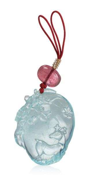 Petit pendentif en tourmaline finement sculpté d'un daim sous un prunus en fleurs orné d'un cabochon en tourmaline rose et petites perles.