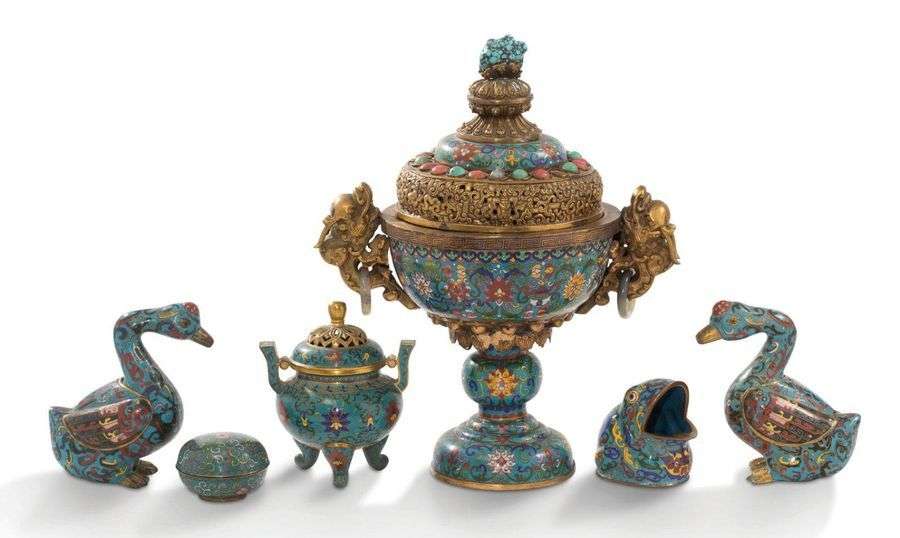 Ensemble de 6 pièces en cuivre et émaux cloisonnés polychromes sur fond bleu comprenant un grand brûle-parfum sur piédouche à décor de rinceaux de lotus, les anses en forme de chimères, le couvercle ajouré| un couple de canards, le dos formant couvercle| un petit brûleparfum couvert à décor de rinceaux de lotus| une boîte couverte| et un crapaud formant cendrier.