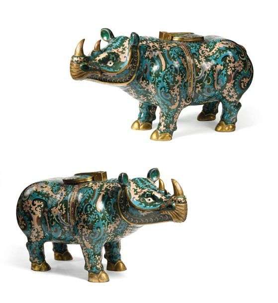 Paire de rhinocéros formant brûle-parfums en cuivre et émaux polychromes et doré, à décor de motifs stylisés archaïsants en vert et rose pâle sur fond turquoise.
