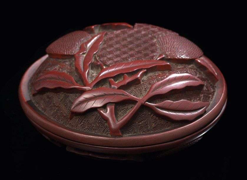 Petite boîte circulaire en laque de cinabre, à décor de litchis sur fond de motifs géométriques.