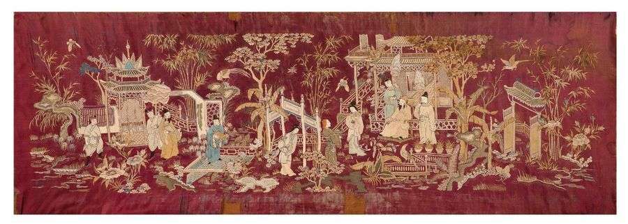 Grande tenture en soie et lin brodé, à décor d'une cérémonie d'offrandes à un dignitaire.