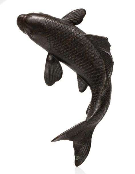 Okimono en bronze de patine brune, représentant une carpe, la queue revenant vers la gauche. Signé «Hidenao» sur le ventre.