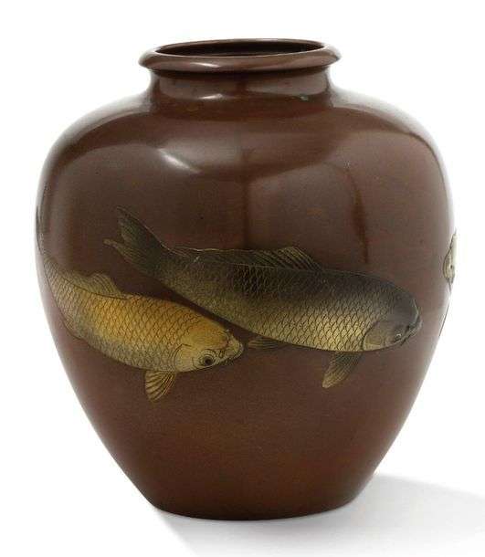 Vase ovoïde à ouverture ourlée en cuivre de patine bronze, à décor de carpes.