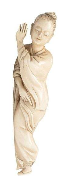 Okimono en ivoire, représentant une jeune femme dansant sur un pied, retenant un pan de son vêtement. Signé Mitsukazu.