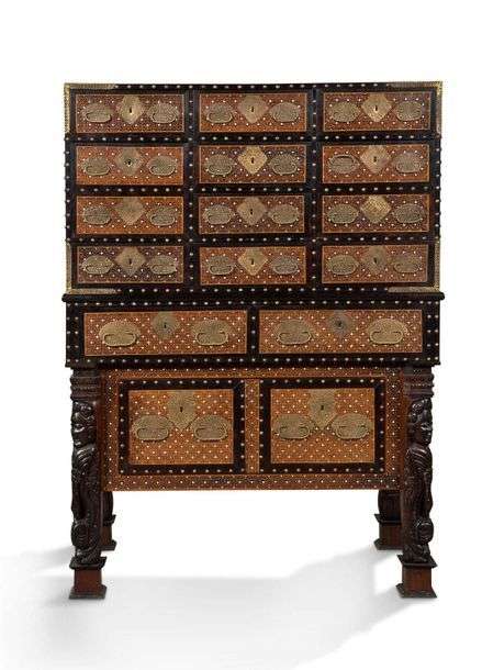 Cabinet dit «Contador» en deux parties, en bois sculpté et en placage de bois exotiques et os à décor de cercles entrelacés, centrés d'étoile à huit branches dans des encadrements ornés de clous simulés| la partie supérieure, formant cabinet, est munie de poignées latérales et ouvre à dix tiroirs (en simulant douze) sur quatre rangs| la partie inférieure ouvre à trois tiroirs en simulant quatre| le meuble repose sur quatre pieds en forme de termes engainées| entrées de serrure et poignées avec platines en laiton ajouré.