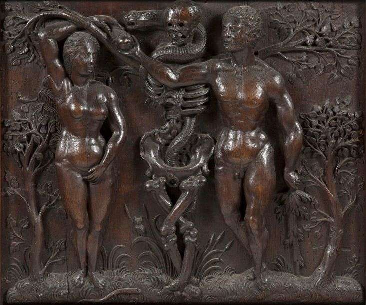 nus, cette dernière tendant le fruit à Adam.