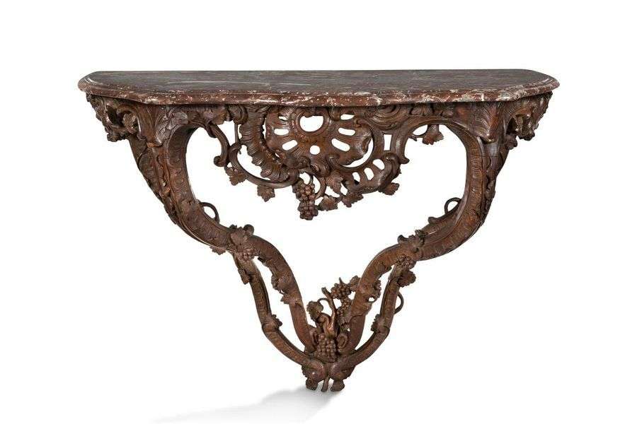 CONSOLE en hêtre mouluré patiné et finement sculpté à bords à riche décor ajouré rocaille de pampres, entrelacs et agrafes. Elle est ornée en ceinture d'une large coquille éclatée formant tablier| Elle repose sur quatre pieds feuillagés à double console réunis entre eux par un bouquet de raisins. Dessus de marbre rouge veiné gris et blanc. XVIIIe siècle