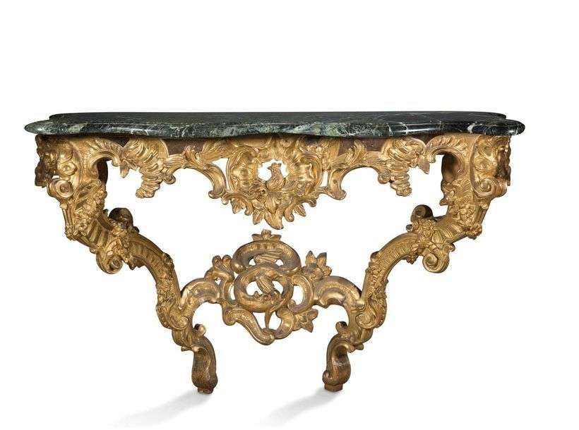 GRANDE CONSOLE D'APPLIQUE de forme chantournée en bois finement sculpté et doré à riche décor rocaille : agrafes, rinceaux, feuillages, ailes. La ceinture ajourée de forme mouvementée est ornée en son centre d'une grenade éclatée. Elle repose sur deux pieds en triple console à enroulements réunis entre eux par une entretoise à décor ajouré d'un dauphin enroulé dans une frise d'agrafes.Plateau de marbre vert de Merde forme mouvementée. Epoque XVIIIe siècle