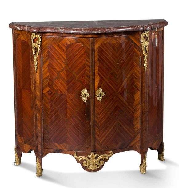 MEUBLE À HAUTEUR D'APPUI de forme galbée marqueté en feuilles de bois de violette, satiné, et palissandre formant filets géométriques et réserves sur les trois faces. Il ouvre par deux vantaux découvrant à l'intérieur une marqueterie de citronnier et bois de violette formé de motifs de losanges.