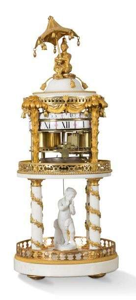 PENDULE en marbre blanc et bronze doré en forme de temple rond à quatre colonnes autour d'un statuette en biscuit d'un enfant à la colombe. Terrasse à quatre palmiers de bronze doré soutenant le mouvement apparent à cadrans tournants à douze pièces d'émail et sonnerie. A l'amortissement, un chinois assis sous une ombrelle.
