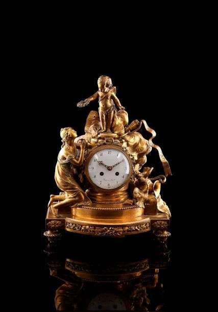 PENDULE en bronze doré et ciselé figurant l'amour couronnant une jeune femme, le cadran signé «Robin à Paris». Epoque Louis XVI