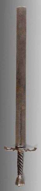 EPÉE DITE WALONNE Large lame lenticulaire à tranchants parallèles et gouttière au premier tiers, garde à quillons en volutes ouvertes, fusée de bois torsadé, pommeau de fer tronçonique, gravure dans la gouttière à trois globes crucifères marqués d'un w.