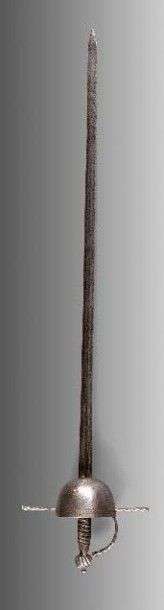 EPÉE à lame large cannelée et pointe en ogive, quillons cintrés et anneau ouvragé, Pommeau facetté en lanternon.