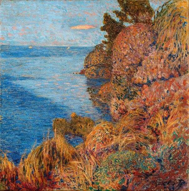 Cette marine est une très belle synthèse des thèmes favoris de Merello. Une falaise s’impose face à la mer. Son sommet dépasse la ligne d’horizon, ses abords particulièrement escarpés sont le lieu d’une végétation dense et sauvage. Les couleurs sont ici juxtaposées, appliquées côte à côte par coups de pinceaux et non pas par point. Comme l’explique les théories du divisionnisme, c’est le mélange optique de ces pigments qui permet une meilleure représentation de la lumière naturelle ainsi qu’une augmentation de l’intensité des couleurs. Grâce à ce traitement, Merello parvient donc à dépasser la scène représentée. Il retranscrit la nature dans tous ses aspects, y compris ses dimensions symboliques.
