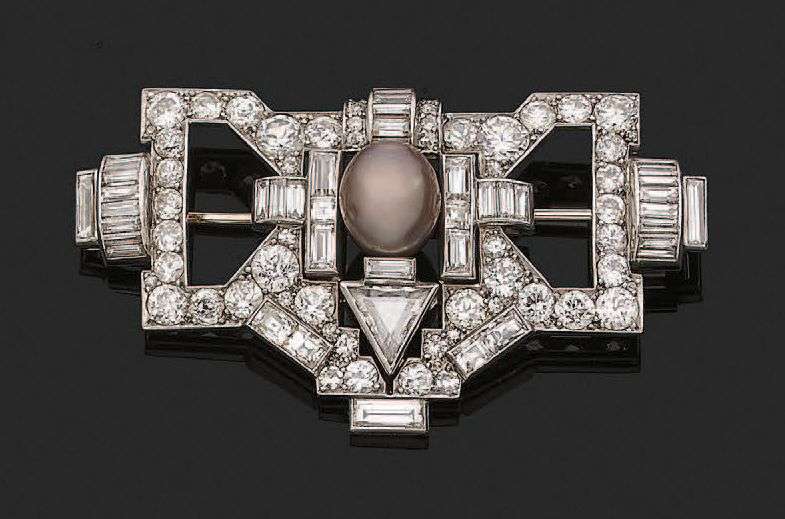 Perle fine, diamants ronds et baguettes, diamant triangle, or 18K (750), platine (850)