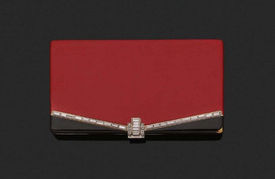 «Il y a longtemps que Lacloche s'est distingué dans cet art (..) pour montrer quel sens aigu du raffinement il apportait à cet accessoire, un des plus personnels qu'une femme puisse avoir » écrira Vogue suite à l'Exposition universelle de 1925. De la Belle Époque aux années 1960, Maison Lacloche fût l'une des gloires de la joaillerie parisienne et fera du nécessaire de beauté – également appelé vanity case – sa spécialité. Véritable ôde à la femme moderne, le nécessaire devint rapidement l'accessoire incontournable des coquettes émancipées des Années folles de l'après-guerre. Aussi précieux à l'intérieur qu'à l'extérieur, cet élégant objet rivalise dans le luxe des matériaux utilisés. Tel un diptyque, des volets en or se déploient pour dévoiler deux compartiments accueillant poudres et autres fards au-dessus desquels s'incruste délicatement un miroir. Véritable novateur, l'artisan joaillier démontre une ingéniosité avant-gardiste dans l'arrangement d'un espace minuscule. Au-delà de l'aspect purement utilitaire, le modèle que nous proposons revêt l'apparence sobre et géométrique du langage avant-gardiste. À l'imitation des laques d'Extrême-Orient alors en vogue, le décor est composé d'émaux rouge et noir enrichis d'une frise et d'un fermoir sertis de diamants baguette calibrés..»