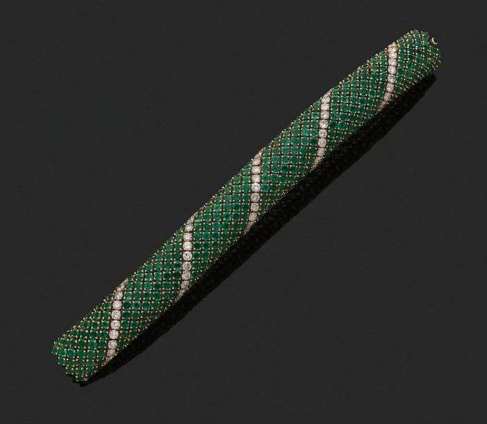 BRACELET Emeraudes, diamants ronds taille brillant, or jaune 18K (750)
