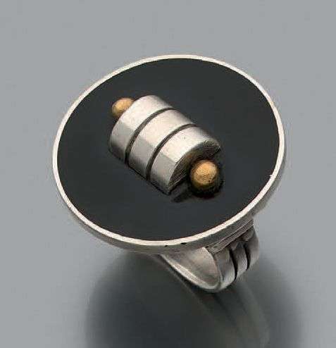 An onyx, gold and silver ring
