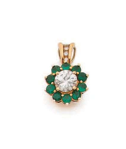Diamant rond taille brillant, entourage émeraudes, or 18K (750)