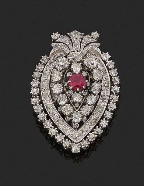 BROCHE Rubis, diamants taille ancienne, or gris 18K (750)