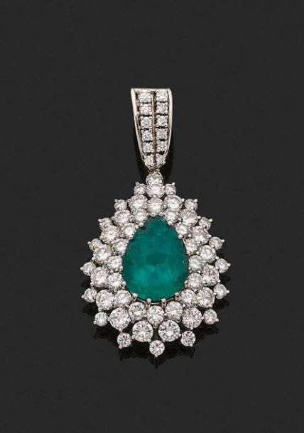 Emeraude en poire, diamants ronds taille brillant, or gris 18K (750)