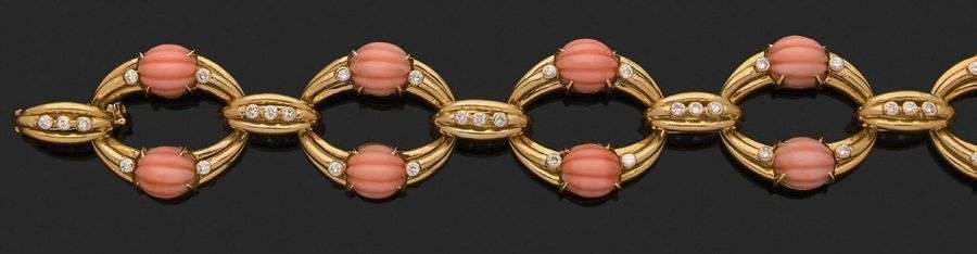 A coral, diamond and gold bracelet