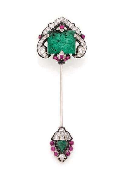 Emeraude gravée, diamants ronds, rubis et onyx et émail noir, platine (950). Vers 1925, signée et numérotée - Poinçon de maître Renault ? Poids de l'émeraude principale : 10.81 carats